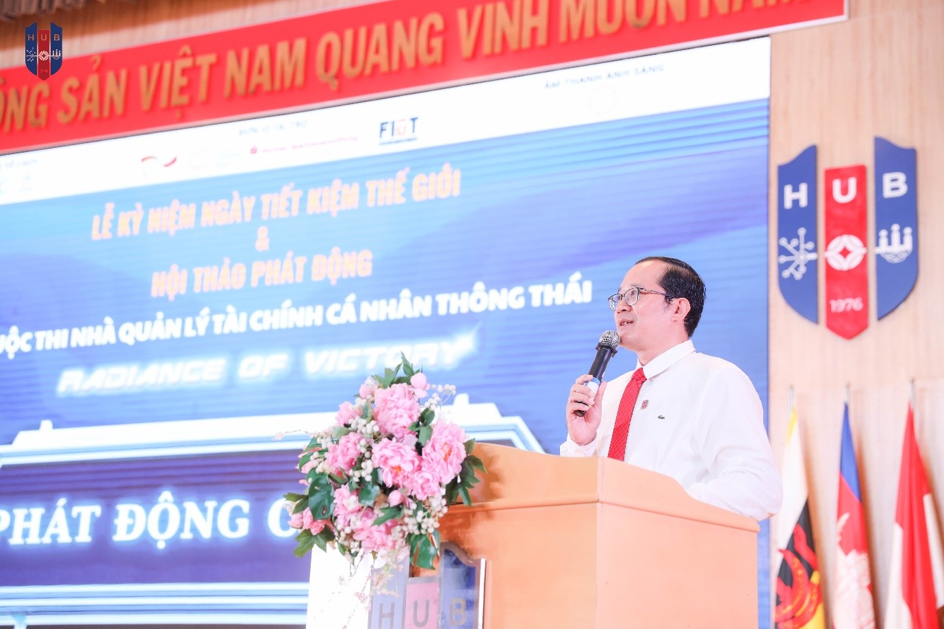 Phát biểu khai mạc Chương trình, PGS. TS. Nguyễn Đức Trung, Hiệu trưởng HUB nhấn mạnh, Trường Đại học Ngân hàng TP.HCM phối hợp với Quỹ hợp tác quốc tế các ngân hàng Tiết kiệm Đức (DSIK) tổ chức Kỷ niệm 101 năm ngày Tiết kiệm thế giới (31/12/2025) để cùng lan toả tới cộng đồng những thông điệp về vai trò và ý nghĩa của tiết kiệm đối với tương lai bền vững. Đây không chỉ là dịp để chúng ta cùng nâng cao nhận thức của cộng đồng, đặc biệt là người trẻ về vai trò của tiết kiệm, mà còn lan toả các kiến thức, kỹ năng về tạo lập và sử dụng các nguồn tài chính một cách hiệu quả nhất để làm nền tảng vững chắc cho cuộc sống hạnh phúc. Và hội thảo phát động cuộc thi Nhà quản lý Tài chính cá nhân thông thái mùa 4 của HUB ngày hôm nay cũng là một hành động rất ý nghĩa để hưởng ứng WSD. Trải qua 3 mùa tổ chức, cuộc thi là nơi mỗi sinh viên được khám phá, trau dồi và nâng tầm nhận thức và năng lực quản lý tài chính của chính mình, cũng như khai phá những tiềm năng trở thành Nhà tư vấn, quản lý, hoạch định tài chính cá nhân. Nhà quản lý tài chính cá nhân thông thái cần trở lại với mùa thứ 4 mới mẻ, bứt phá và khác biệt hơn; không chỉ dành cho sinh viên HUB mà còn cho sinh viên các trường bạn; không chỉ dành cho sinh viên khối ngành Tài chính, ngân hàng, kinh tế, kinh doanh mà còn sinh viên các ngành khác trong bối cảnh định hướng đào tạo đa ngành và liên ngành của HUB đang được triển khai mạnh mẽ.